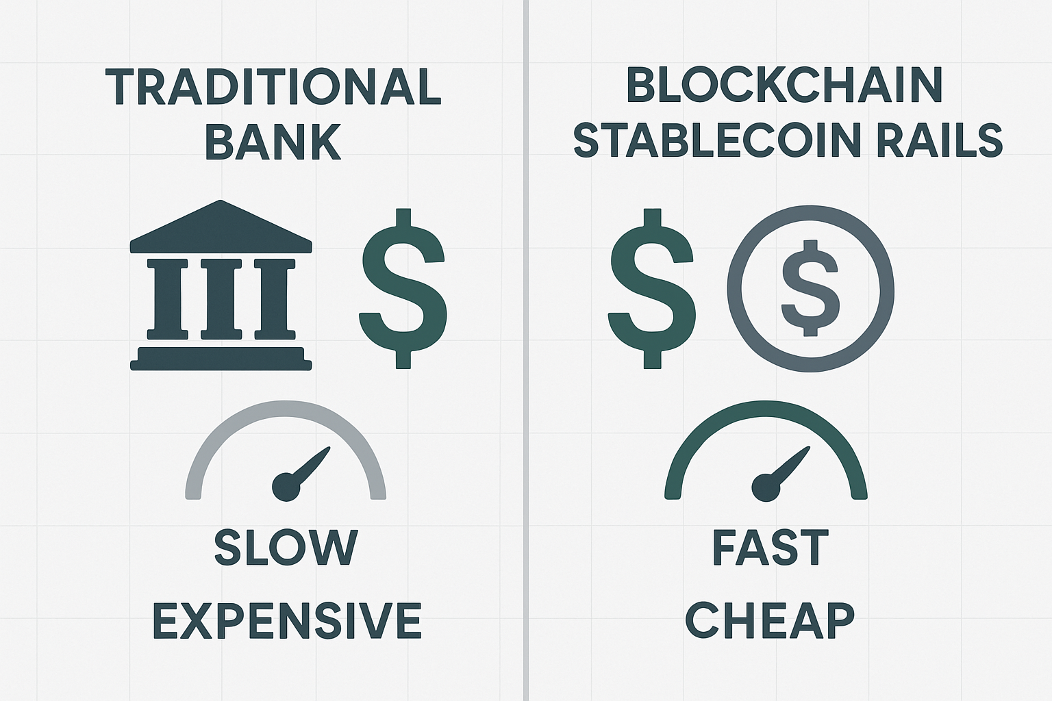 Split-screen showing traditional bank payment processing (slow, expensive) versus blockchain stablecoin rails (fast, cheap)