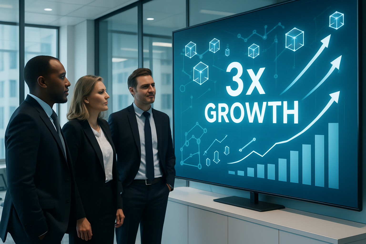 Corporate executives in a modern office looking at rising charts and blockchain graphics, with "3x Growth" prominently displayed