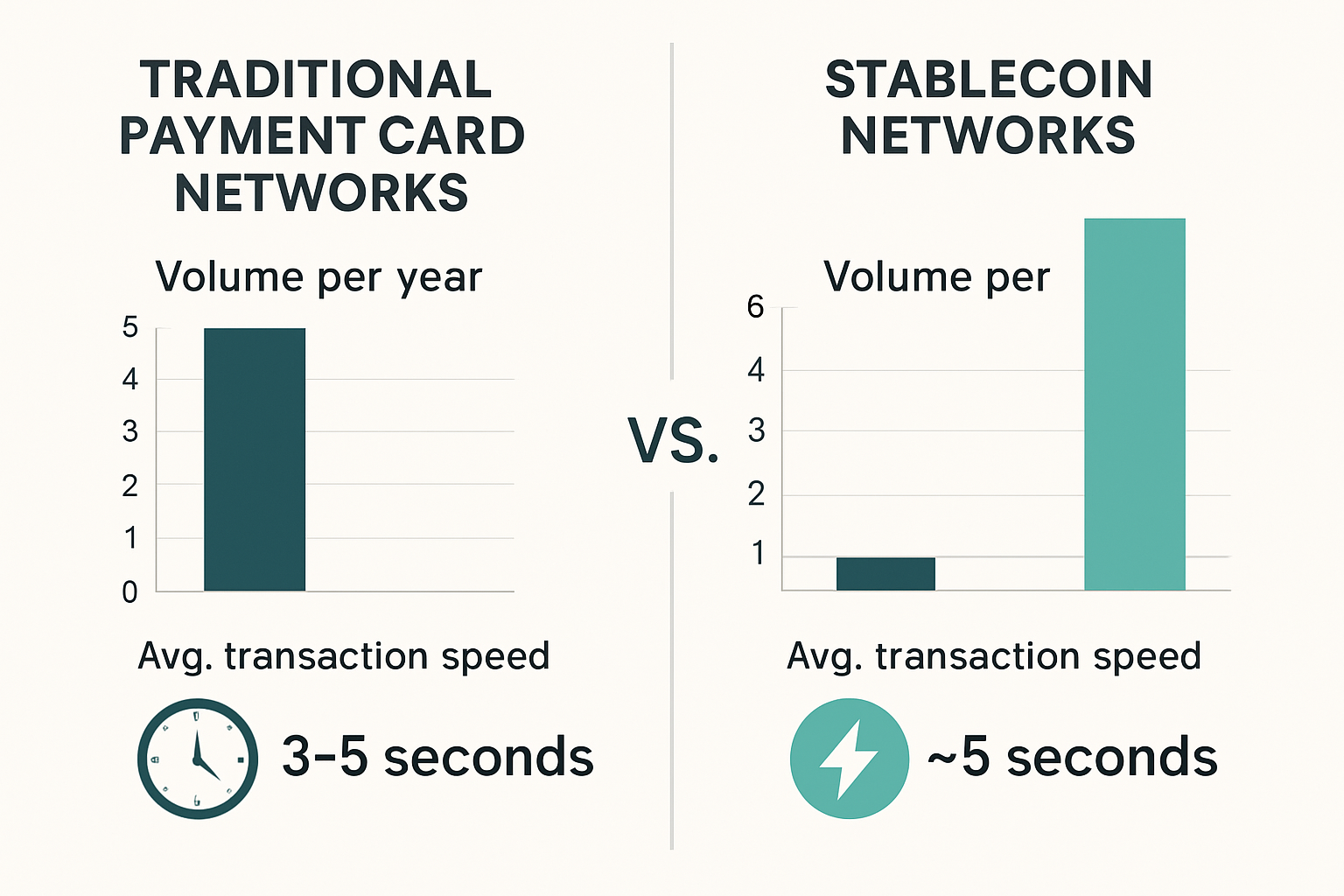 Comparison infographic showing traditional payment card networks versus stablecoin networks, with volume metrics and speed comparisons