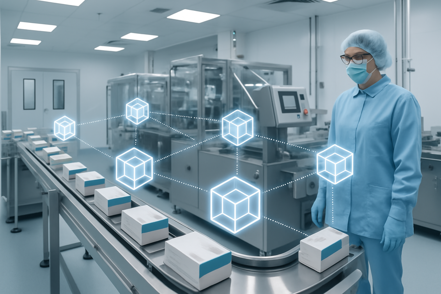 Modern pharmaceutical facility with blockchain network overlay showing drug packages being tracked through the supply chain